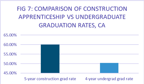 The data reveal that construction apprenticeships provide substantially more training hours for participants than California bachelors degree programs, deliver substantially higher graduation rates, and produce average exit wages on par with college graduates.