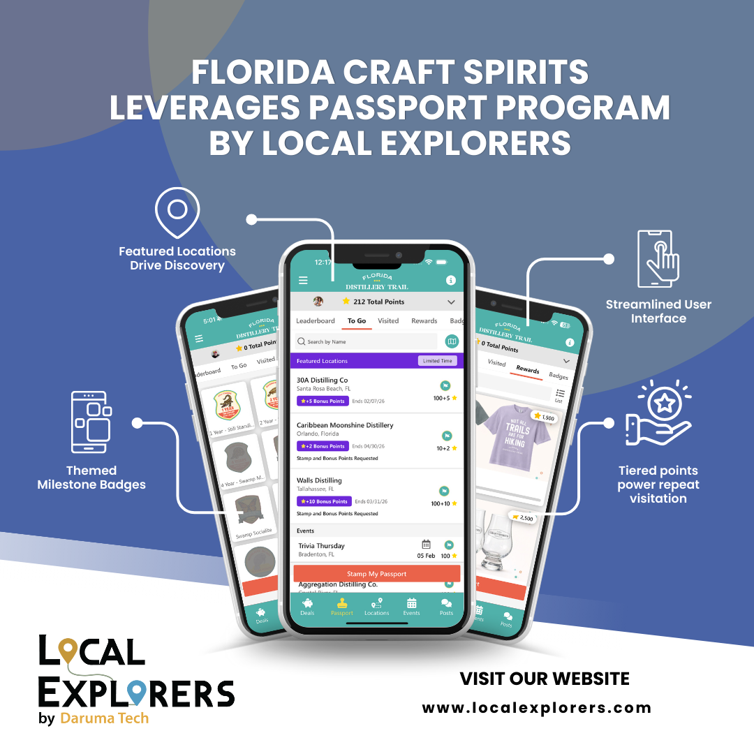 BOCA RATON, FL, UNITED STATES, February 24, 2026 /EINPresswire.com/ -- Local Explorers, an award-winning creator of mobile apps for destination marketing organizations, tourism boards, and other promoters of regional tourism and commerce, has teamed again with the Florida Craft Spirits Association (FCSA) to relaunch the popular Florida Distillery Trail app with new features to incentivize repeat visits to favorite venues.